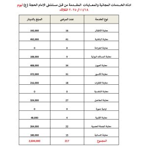العيادات الاستشارية المجانية لهذا اليوم، الثلاثاء 2025/11/18 في مستشفى الإمام الحجة (عج) الخيري