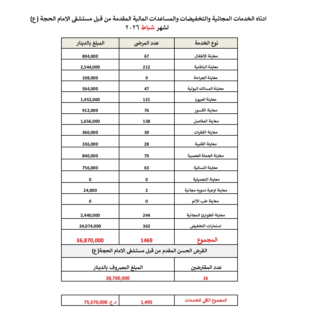 أعلن مستشفى الإمام الحجة (عج) الخيري عن حجم الخدمات المجانية والتخفيضات والمساعدات المالية المقدَّمة خلال شهر شباط 2026، مؤكدًا استمرار نهجه الإنساني في دعم المرضى وتخفيف الأعباء المالية عن كاهل العوائل المتعففة.