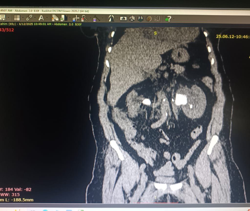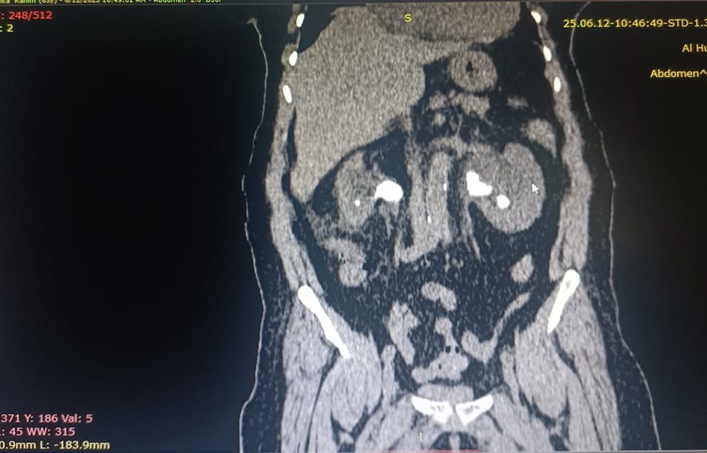 “بعد شهرين أجرينا عملية رفع حصى الكلية اليمنى باستخدام تقنية ناظور الحالب والكلية المرن الحديثة، والتي مكنتنا من إزالة الحصوات بكفاءة عالية دون جراحة تقليدية.”