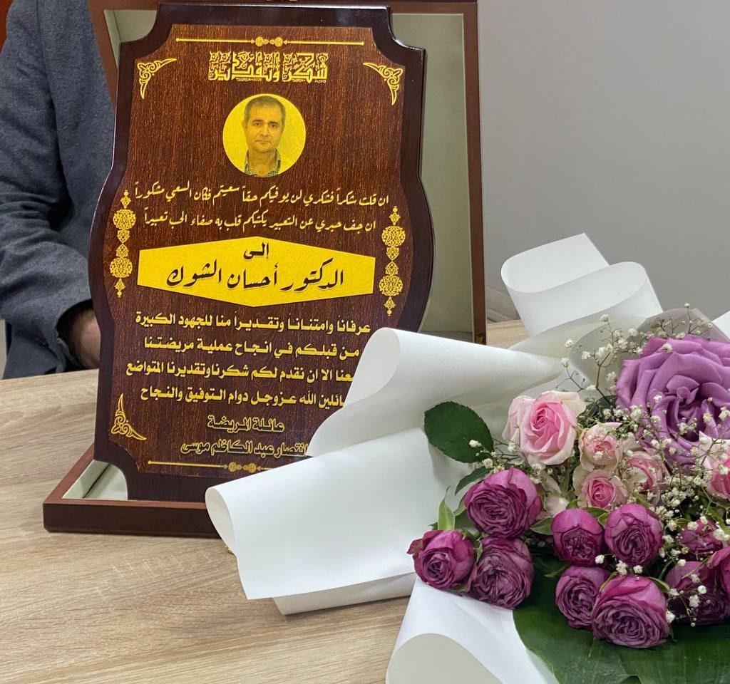 وفي لفتة إنسانية مؤثرة، عبّر ذوو المريضة عن بالغ امتنانهم وتقديرهم للدكتور إحسان الشوك، لما بذله من جهود مهنية وإنسانية أسهمت، بعد الله، في إنقاذ حياة ابنتهم. حيث قدموا له وسام شكر وباقة ورد، تعبيرًا صادقًا عن الامتنان والثقة.