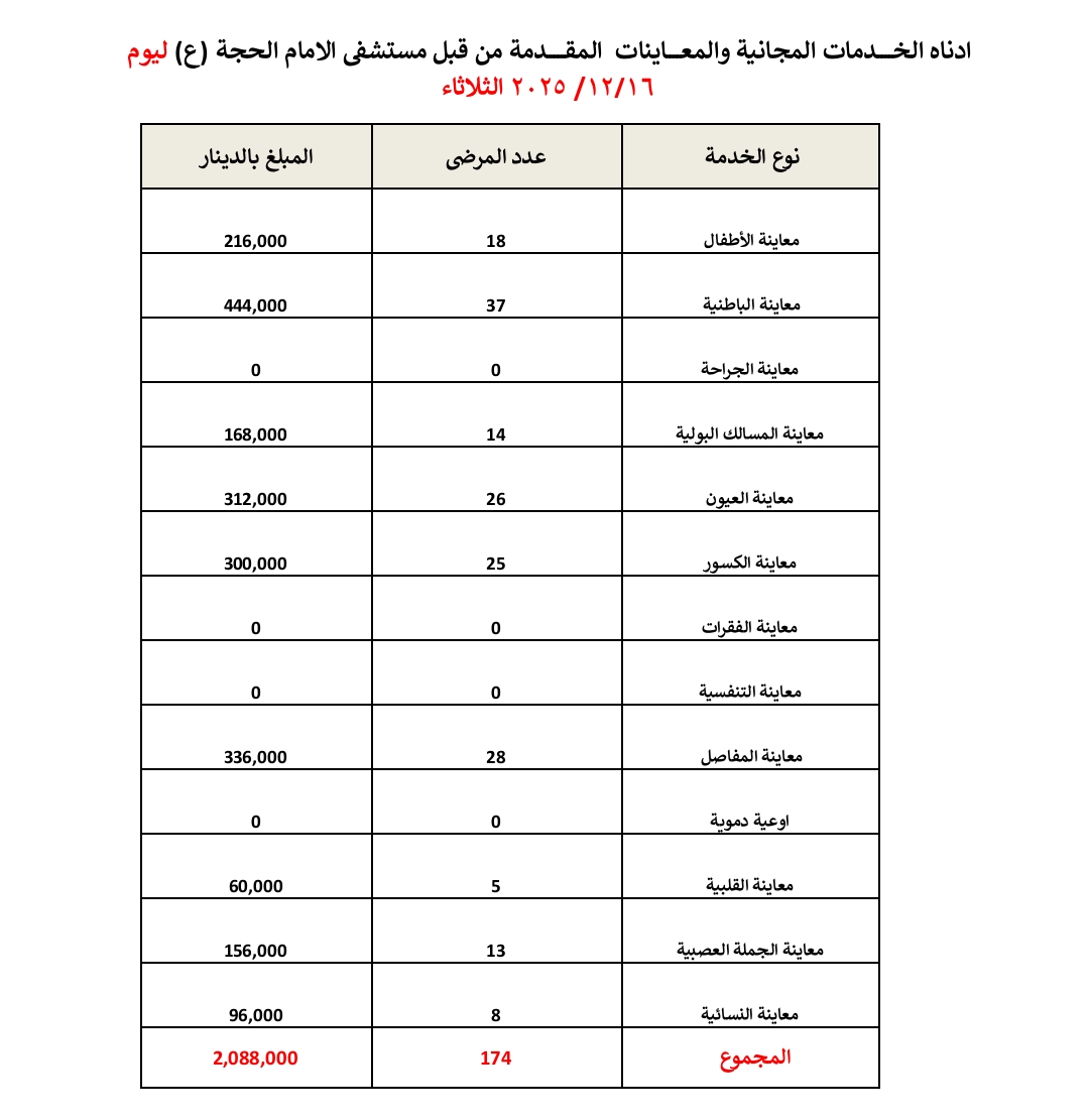وبحسب الإحصائية المُرفقة، بلغ عدد المراجعين 174 مراجعًا، فيما تجاوزت كلفة الخدمات المقدمة مليونين دينار عراقي، تكفلت بها إدارة المستشفى دعمًا للمرضى وتخفيفًا للأعباء المعيشية عن كاهلهم.