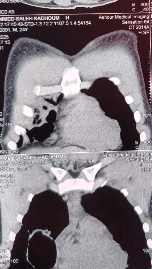 الشاب، وهو من محافظة بغداد، كان قد خضع في وقت سابق لتدخل جراحي غير ناجح في أحد المراكز الصحية، ما أدى إلى تدهور حالته الصحية بشكل كبير ودخولها مرحلة حرجة، تمثلت بوجود نواسير قصبية متعددة ومفتوحة على تجويف الصدر، مع تجمع سوائل والتهابات مزمنة، إضافة إلى ارتباط الكيس بالقصبة الهوائية وحدوث تليفات شديدة في أنسجة الرئة، الأمر الذي دفع عدة مراكز طبية إلى الاعتذار عن استقباله نظرًا لخطورة وتعقيد الحالة.