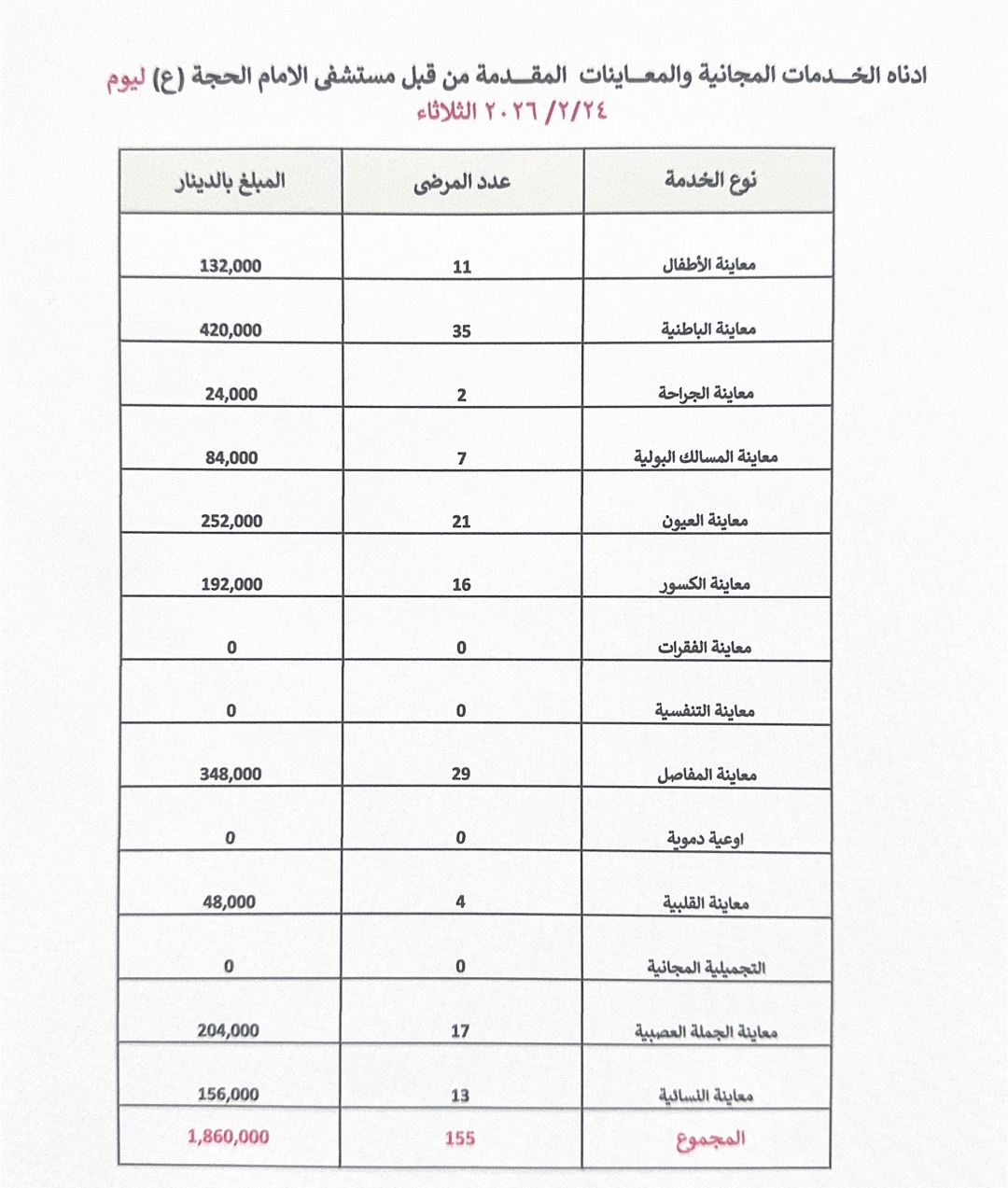 وتحملت إدارة المستشفى التكلفة الكلية للمعاينات والبالغة (1,860,000) دينار عراقي، دعمًا للمرضى وتخفيفًا للأعباء المادية عن كاهلهم.