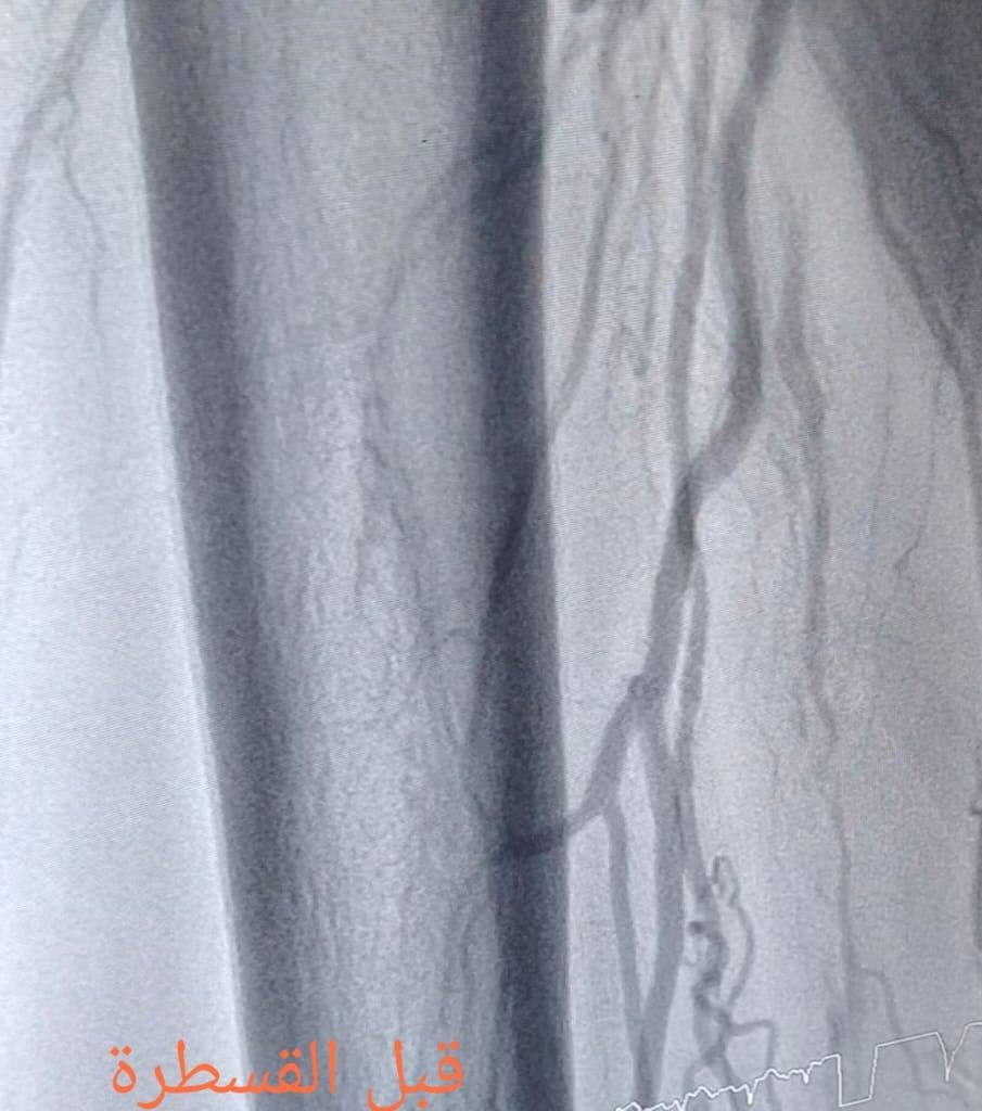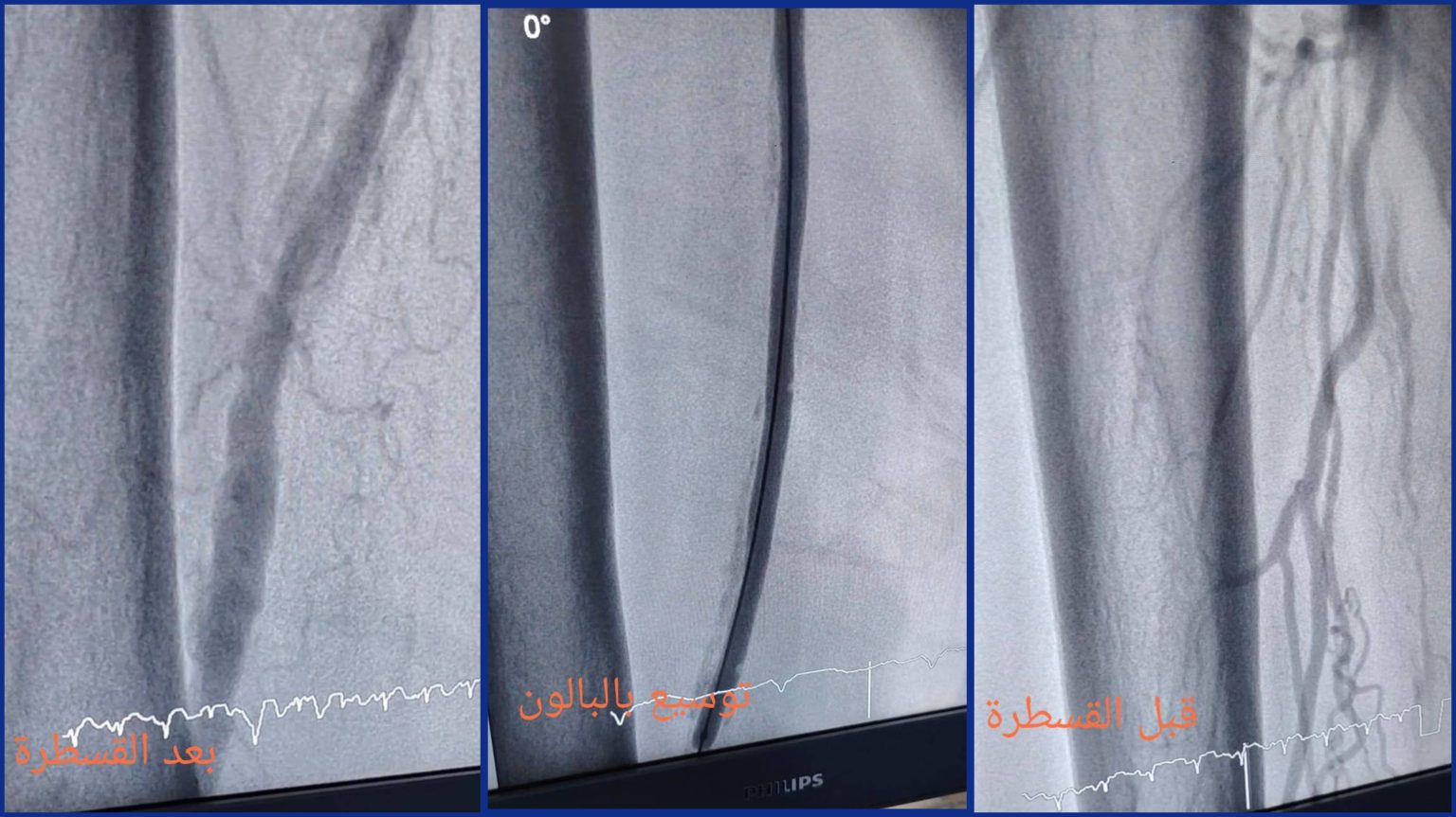 وبعد إجراء الفحوصات السريرية والتصويرية اللازمة، تقرر تنفيذ تداخل قسطاري طارئ، حيث أُجريت للمريض قسطرة تشخيصية وعلاجية في آنٍ واحد، تم خلالها فتح الانسداد في الشريان الفخذي الأيمن، مع توسيع شريان الحوض الأيمن بعملية دقيقة استغرقت ثلاث ساعات متواصلة.