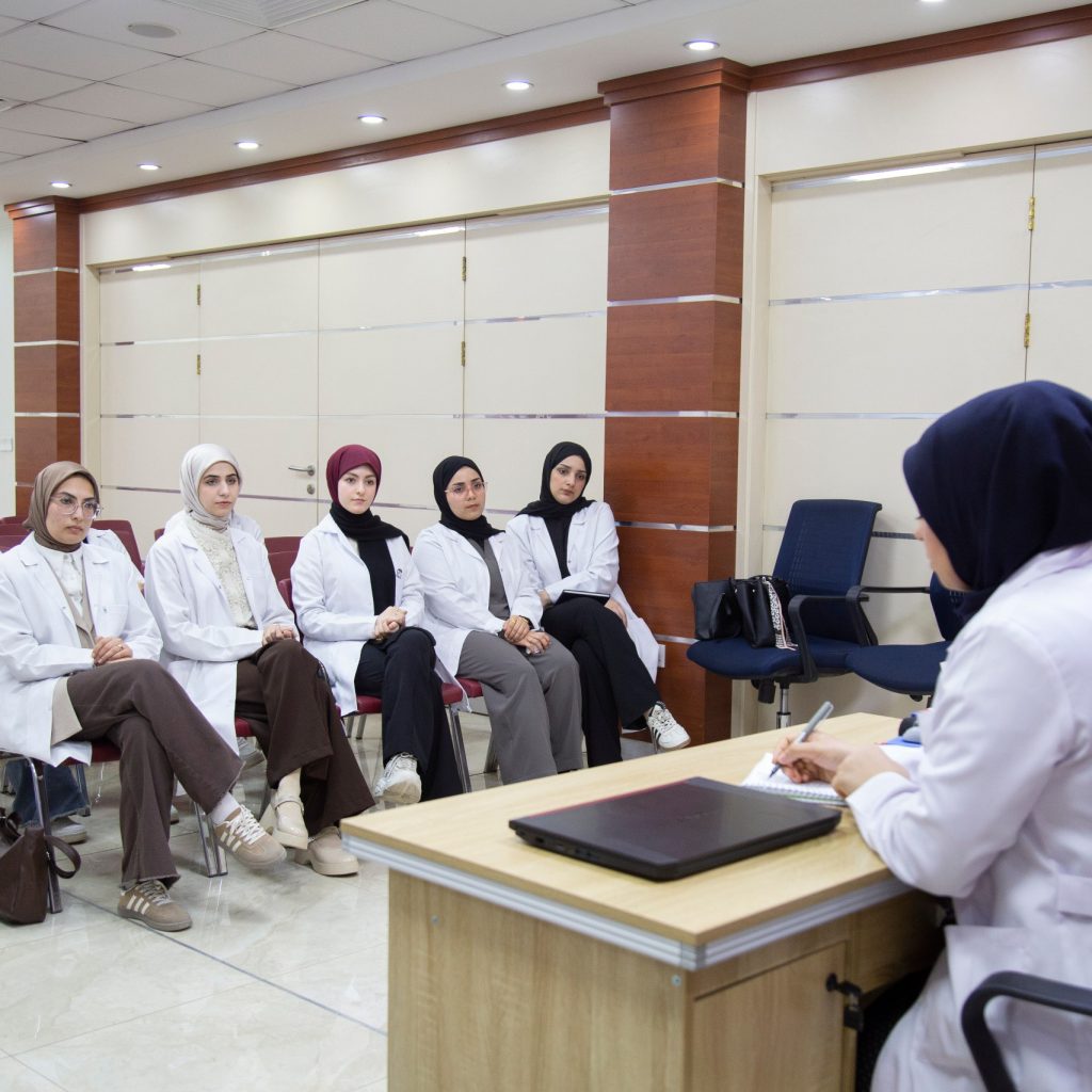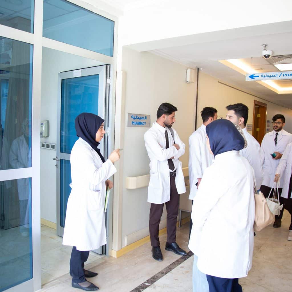 واطلع الطلبة خلال الزيارة على بيئة العمل داخل المستشفى، ولا سيما صيدلية المستشفى، حيث تعرفوا على آليات إدارة الأدوية وخزنها وصرفها، والإجراءات المتبعة لضمان دقة الوصفات وسلامة المرضى، فضلًا عن التعرف على دور الصيدلي السريري في متابعة الخطط العلاجية بالتنسيق مع الكادر الطبي.