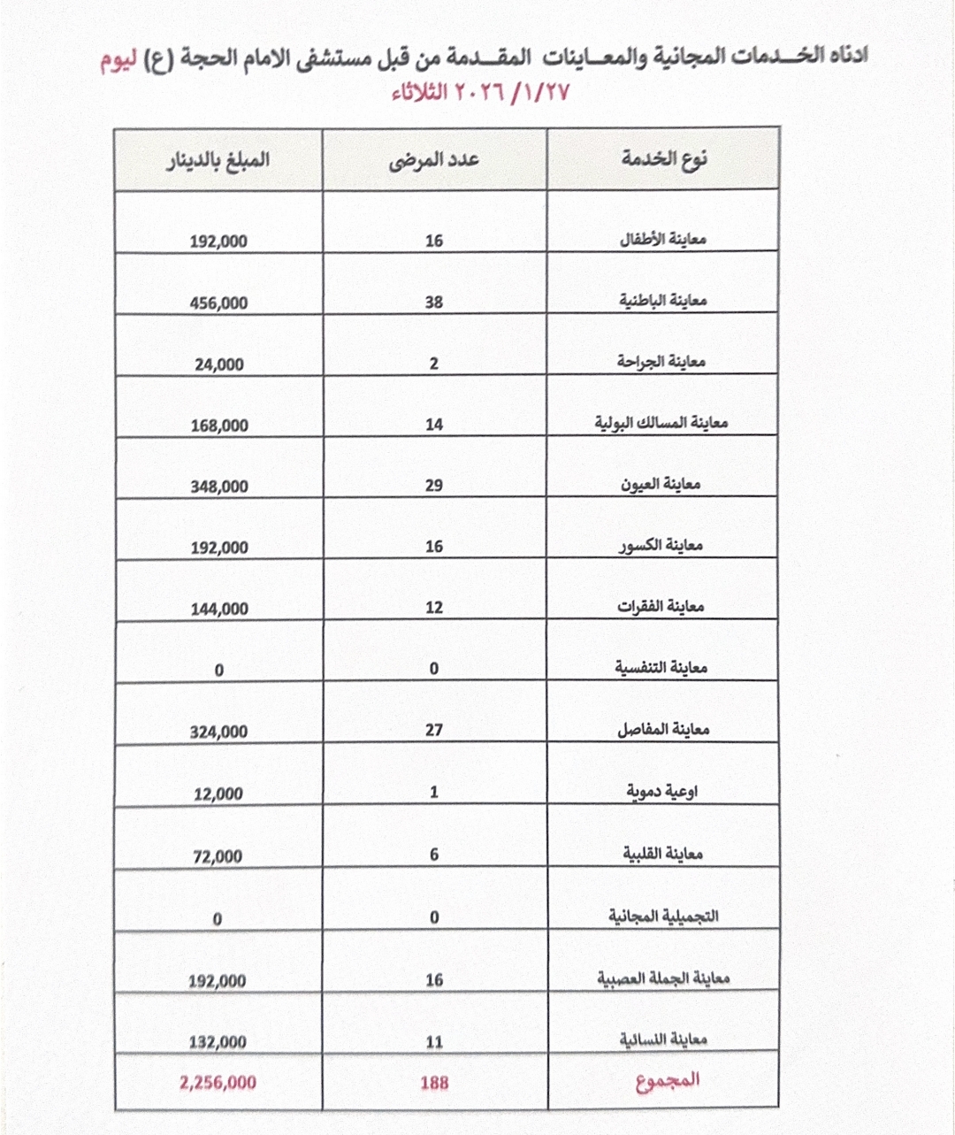 استقبل مستشفى الإمام الحجة (عج) الخيري يوم الثلاثاء الموافق 2026/1/27، وضمن مبادرة «ثلاثاء الخير» للمعاينة الطبية المجانية، 188 مراجعًا، وبكلفة إجمالية بلغت 2,256,000 دينار عراقي تكفلت بها إدارة المستشفى بالكامل.
