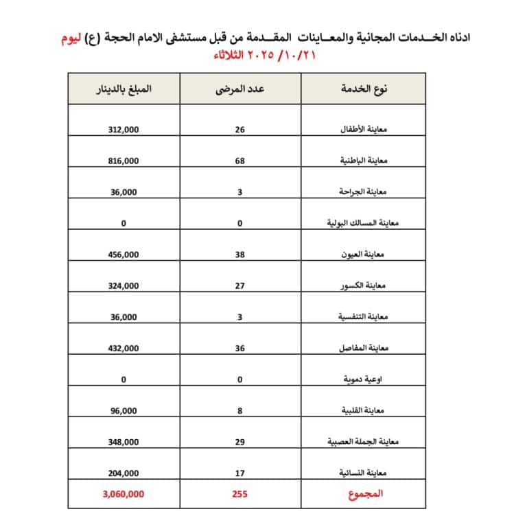منذ عام 2017، يواصل مستشفى الإمام الحجة (عج) الخيري تقديم مبادرته الإنسانية الثابتة كل يوم ثلاثاء، عبر تخصيص نهارٍ كامل لتقديم الخدمات الطبية المجانية لمختلف