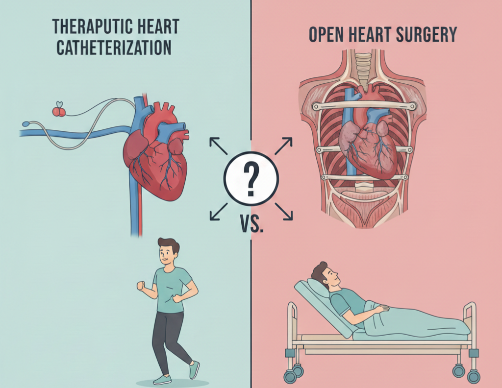 نتيجةً لتطور الوسائل المُستخدمة في القسطرة العلاجية، أصبح بإمكانها أن تحل محل عمليات القلب المفتوح في الكثير من الحالات.