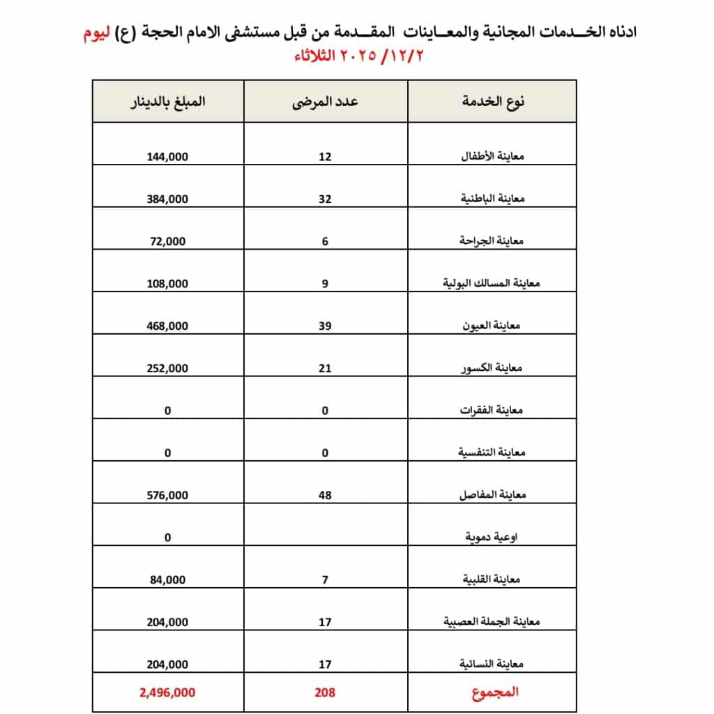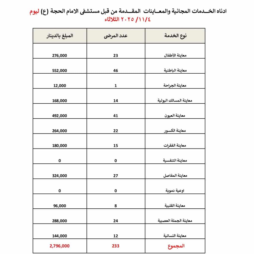 مستشفى الإمام الحجة (ع) الخيري يقدم خدمات مجانية لـ 233 مريضًا في يوم واحد